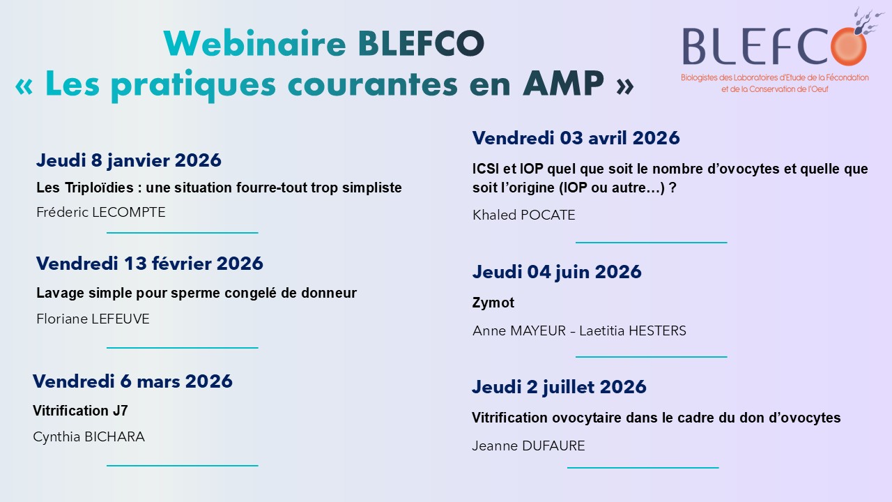 Prochains Webinaires BLEFCO 2026 (1er semestre)Nov 21, 2025 Bonjour à tous Vous trouverez ci dessus le programme des futurs webinaires BLEFCO du prochain semestre 2025, avec 6 nouvelles dates à retenir ! Laure et Marion Nous vous espérons nombreux ! Poster le commentaire Annuler la réponseVotre adresse e-mail ne sera pas publiée. Les champs obligatoires sont indiqués avec *Commentaire * Nom * E-mail * Site web Enregistrer mon nom, mon e-mail et mon site dans le navigateur pour mon prochain commentaire. Saisissez votre réponse en chiffres5 × 5 =
